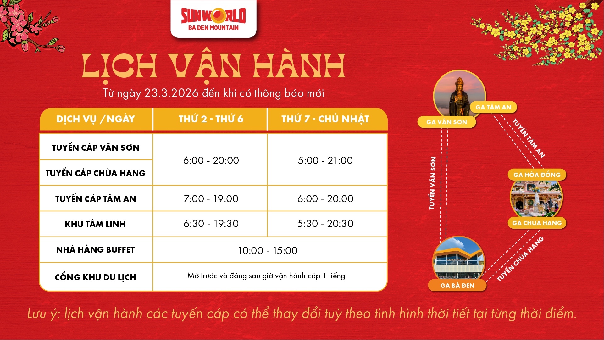 Ban Quản lý Khu du lịch quốc gia Núi Bà Đen xin cập nhật tới Quý khách Bảng giá vé dịch vụ cáp treo, lịch hoạt động tại Khu du lịch, áp dụng cho tất cả du khách từ ngày 16/02/2026 - 03/05/2026